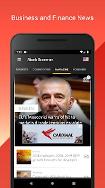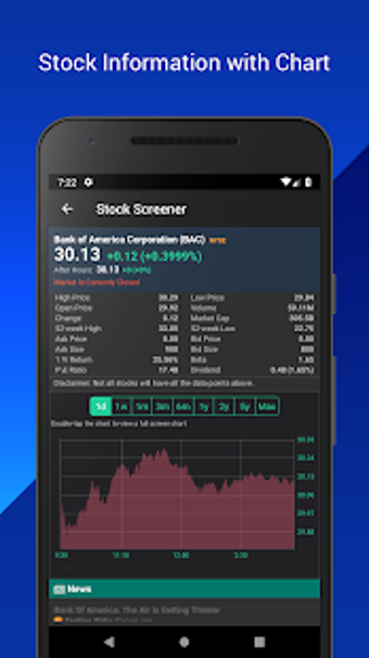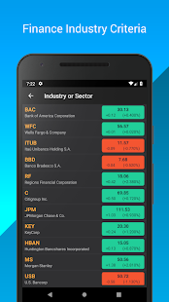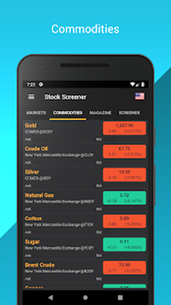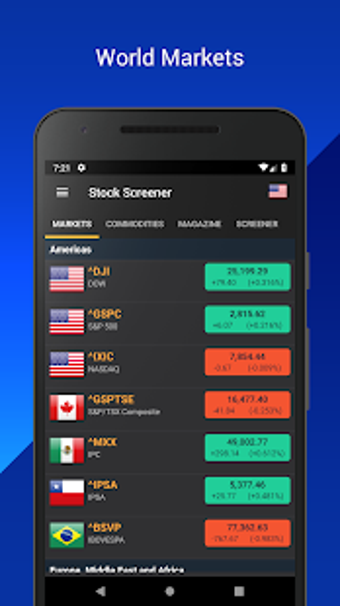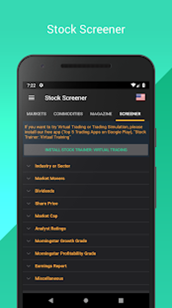 Stock Screener är en app för att hitta aktier baserat på olika kriterier. Kriterierna kan vara en bransch eller sektor, marknadsvärde, aktiekurs och många andra sådana screeningkriterier. Den stöder också olika marknadsindex, råvaror och marknadsnyheter.